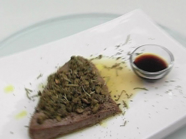 Универсальная печеная закуска из тунца с каперсами.Состав:стейк тунца — 120 гр;каперсы — 1 столовая ложка;лимонный сок — 1 столовая ложка;оливковое масло, соль, перец — по вкусу.